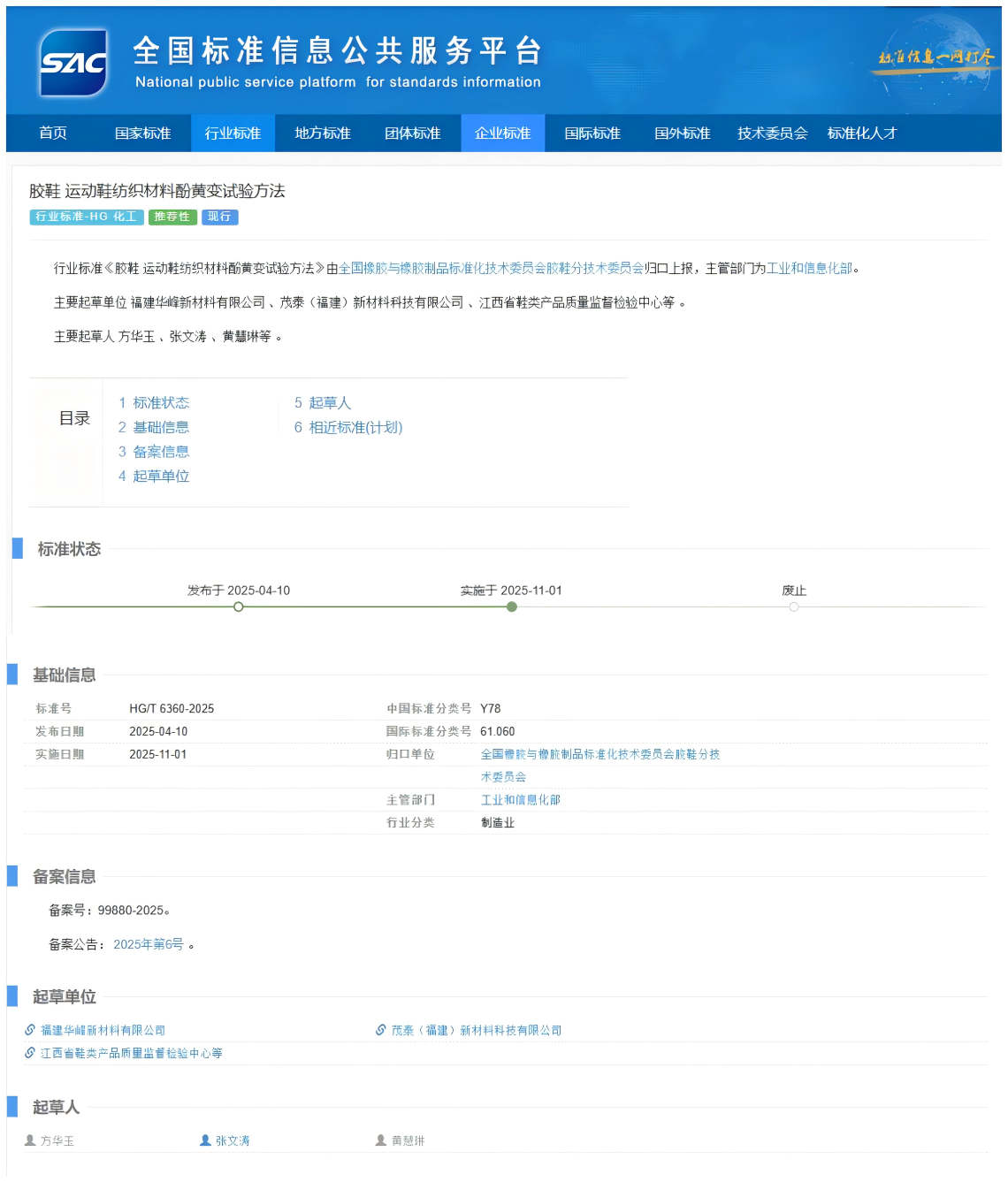 福建省运动鞋服面料重点实验室作为第一起草单位主导制定的HG/T 6360-2025《胶鞋 运动鞋纺织材料酚黄变试验方法》行业标准于2025年11月1日实施。该标准由中华人民共和国工业和信息化部发布。描述了胶鞋、运动鞋纺织材料评定酚黄变程度的试验方法,适用于鞋用纺织材料的酚黄变试验。其他材料(PU、橡塑等材料)可参照使用。