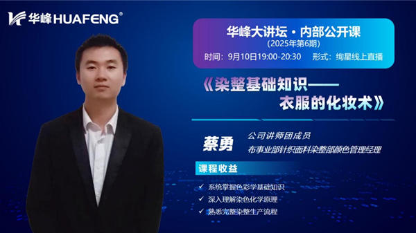 9月10日晚,2025年华峰大讲坛《染整基础知识-衣服的化妆术》线上直播培训在华峰在线学院顺利开展,共吸引一百多名员工踊跃报名学习。
