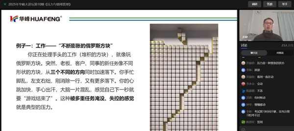 12月25日晚,2025年华峰大讲坛第10期《压力与情绪管理》通过华峰在线学院以直播形式顺利开展。
